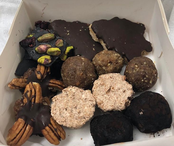Cacao Balls: dates, rolled oats, tahini, maple syrup, sunflower seeds, oat flour, vanilla, coconut oil, sea salt, cocoa powder, cacao nibs